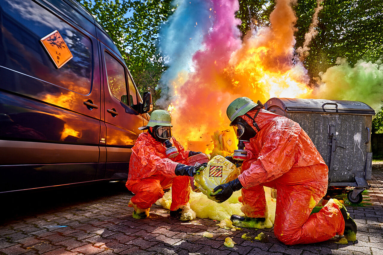 Der Spritzschutzanzug besteht aus einem mehrschichtigen chemikalienbeständigem Material, das weder wasserdampf- noch luftdurchlässig ist. Als zusätzlicher Schutz zu den getragenen Feuerwehrgummistiefeln ist der Schutzanzug mit integrierten Stiefelsocken und ableitfähigem Tropfrand ausgestattet.
